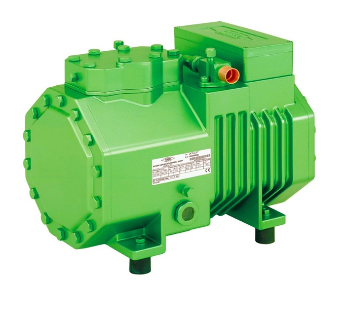 Полугерметичный поршневой компрессор – один из типов компрессоров, который используется для сжатия хладагента в холодильной системе. Он состоит из одного или нескольких цилиндров с поршнями,движущимися внутри них при помощи электродвигателя. При движении поршней, газ поступает в цилиндр через всасывающий клапан, сжимается и выталкивается, через нагнетательный клапан на линию нагнетания. Рабочая камера полугерметичного поршневого компрессора закрыта от внешней среды, благодаря этому, уменьшаются потери газа или жидкости, повышается эффективность и надёжность работы, а также позволяет защитить компрессор от загрязнения и коррозии. Одноступенчатые компрессоры производительностью от 17,5 до 225 м 3 /ч и мощностью двигателей от 3 до 70 л.с. Обычно используется в коммерческом и промышленном холодильном оборудовании и специальных системах кондиционирования воздуха. Доступны в конфигурациях с 2, 4, 6 или 8 цилиндрами для применения при низких и средних температурах. Компрессора могут работать как на R404A, R407C, R507A, R134a, так и на R22. Компрессор поставляется заправленным синтетическим полиэфирным маслом (POE), поэтому для работы с хладагентом R22 может понадобится замена масла на минеральное.