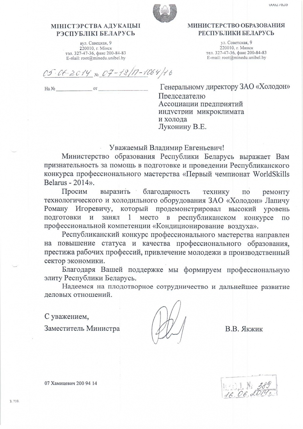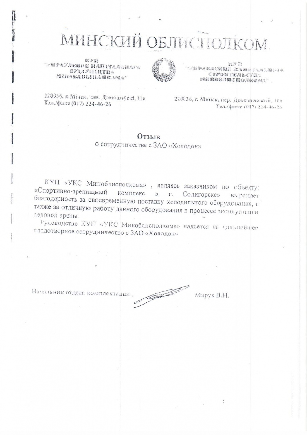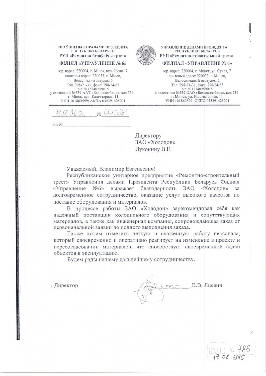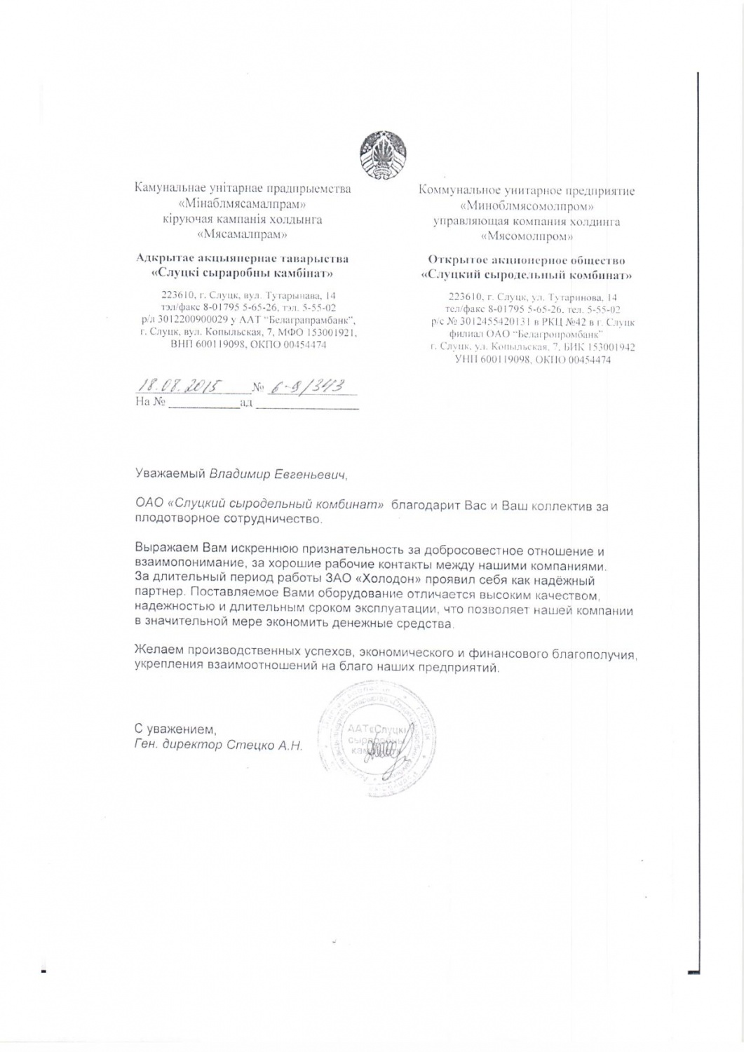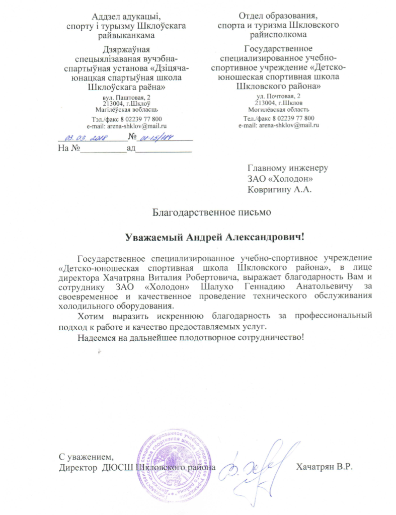 Государственное специализированное учебно-спортивное учреждение «Детско-юношеская спортивная школа Шкловского района», в лице директора Хачатряна Виталия Робертовича, выражает благодарность Вам и сотруднику ЗАО «Холодон» Шалухо Геннадию Анатольевичу за своевременное и качественное проведение технического обслуживания холодильного оборудования.