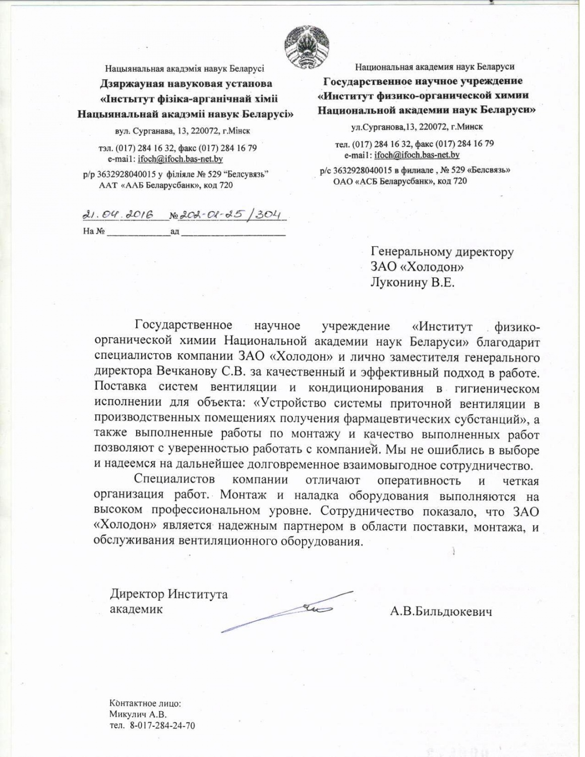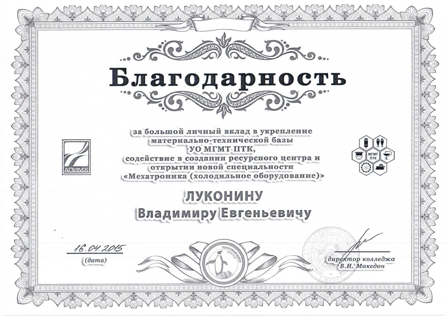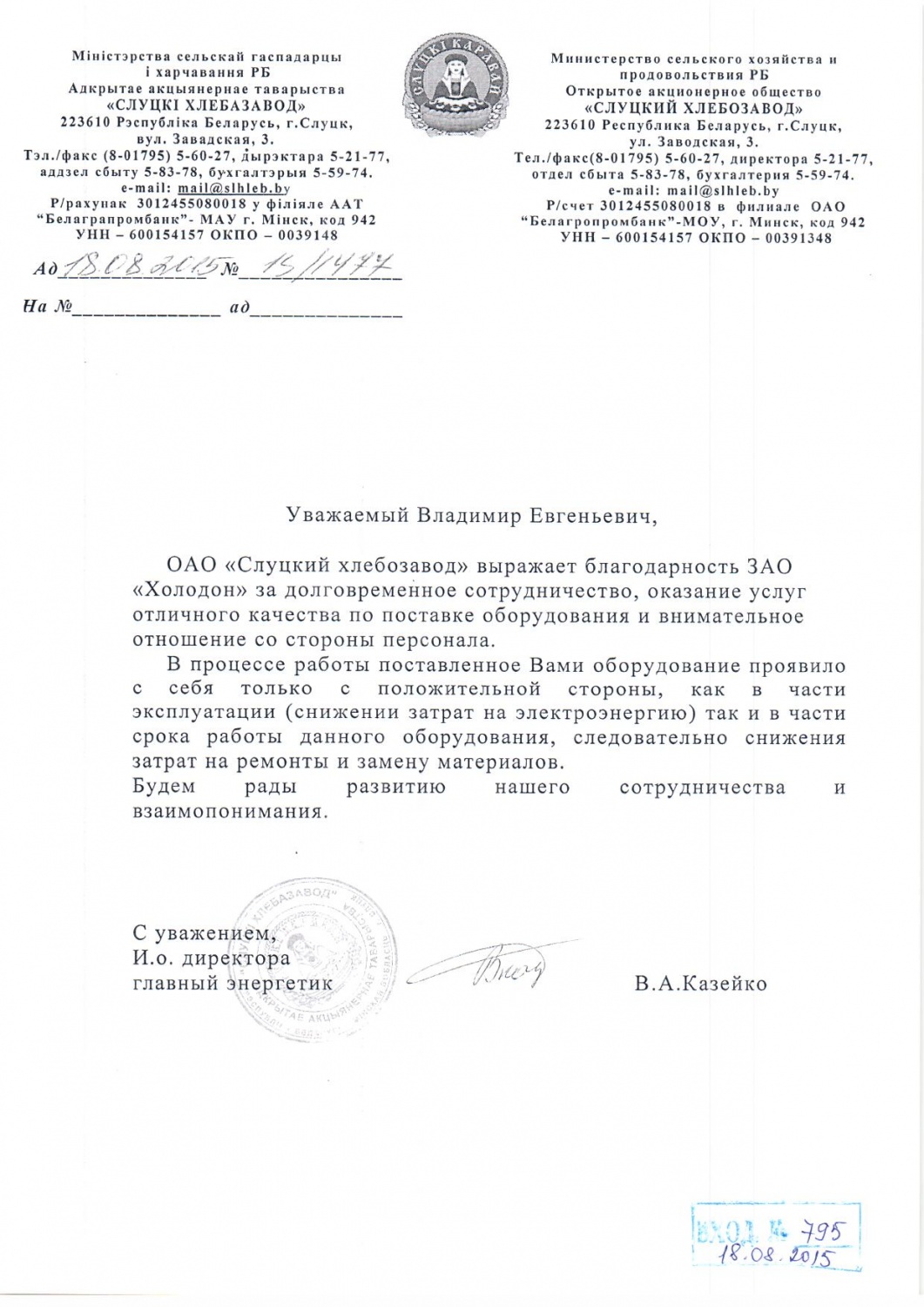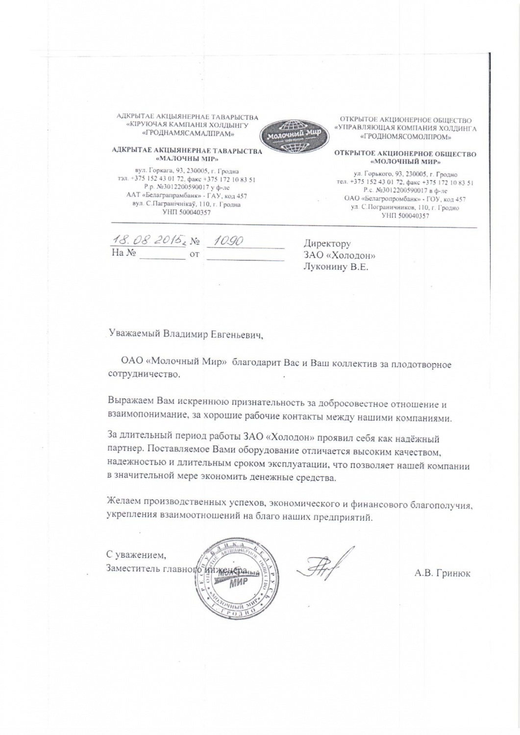 Государственное специализированное учебно-спортивное учреждение «Детско-юношеская спортивная школа Шкловского района», в лице директора Хачатряна Виталия Робертовича, выражает благодарность Вам и сотруднику ЗАО «Холодон» Шалухо Геннадию Анатольевичу за своевременное и качественное проведение технического обслуживания холодильного оборудования.