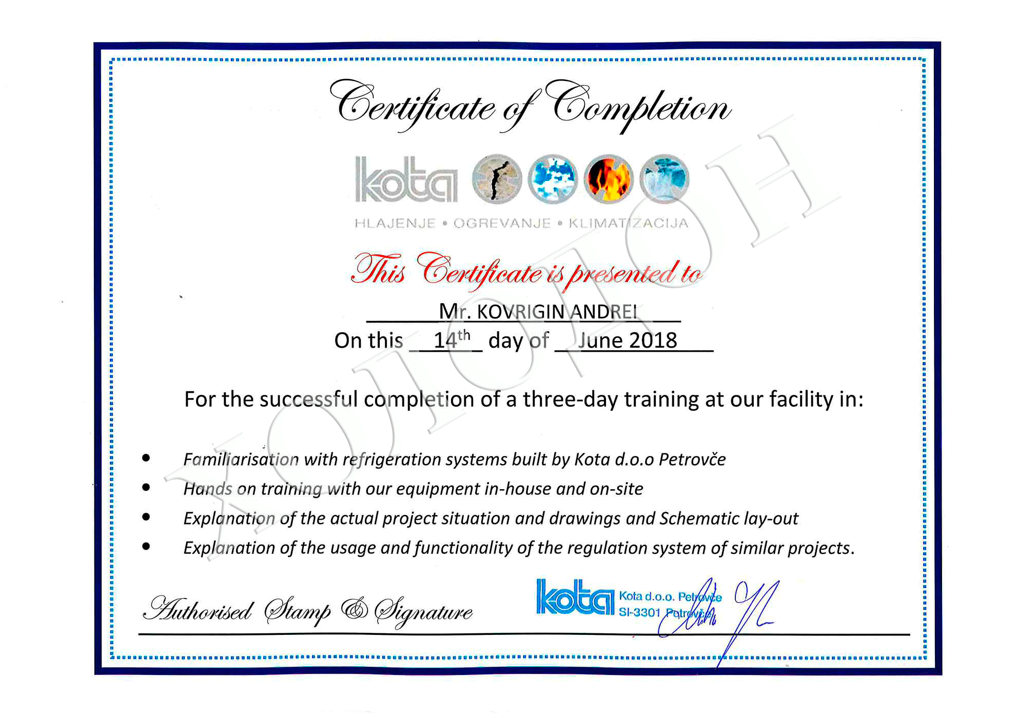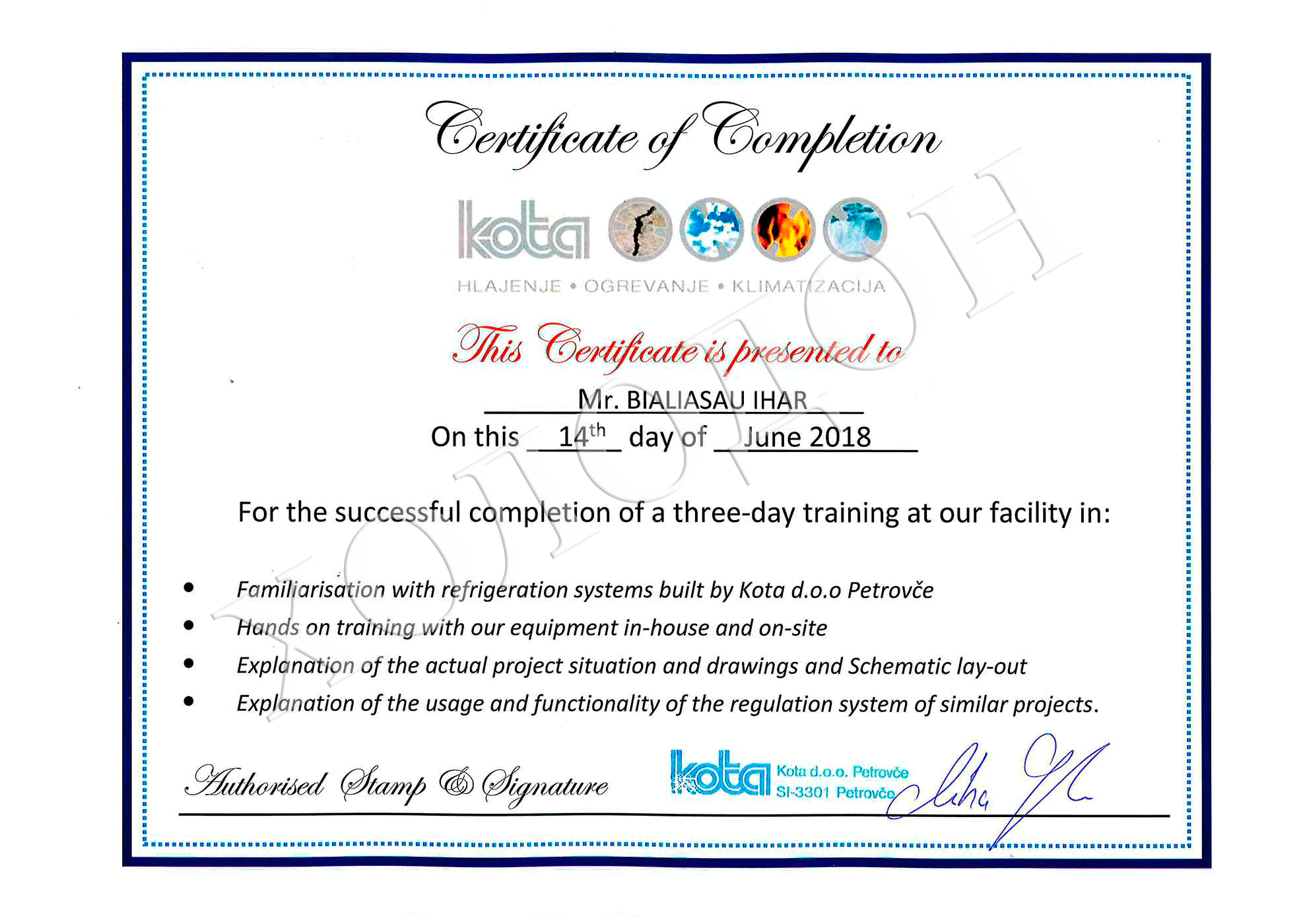 Сотрудники ЗАО Холодон прошли обучение на заводе КОТА d.o.o. Petrovce Словения (http://www.kota.si/) . В ходе образовательного семинара был получен опыт по монтажу и обслуживанию, ремонту и наладке холодильного (фреонового и аммиачного) оборудования на объектах культурно-развлекательного назначения, перерабатывающей пищевой промышленности. Полученые знания, опыт и навыки в области современных европейских систем холодоснабжения будут адаптированы и применены на территории Республики Беларусь.